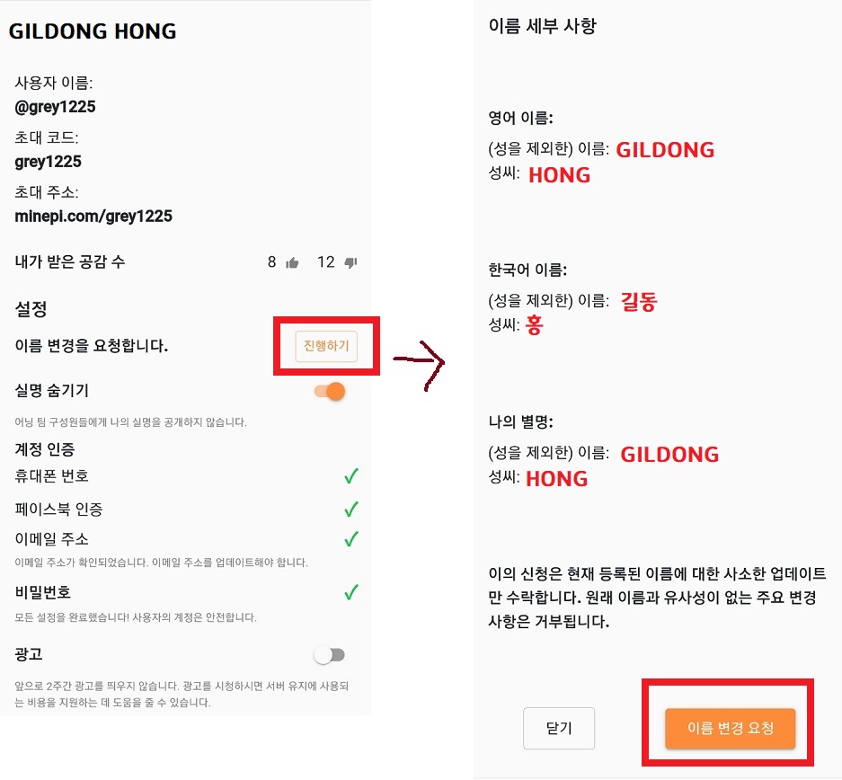 거기 들어가셔서 한국어 이름 ( ex 이름 : 길동 / 성 : 홍 ) 을 추가해주시면 됩니다.