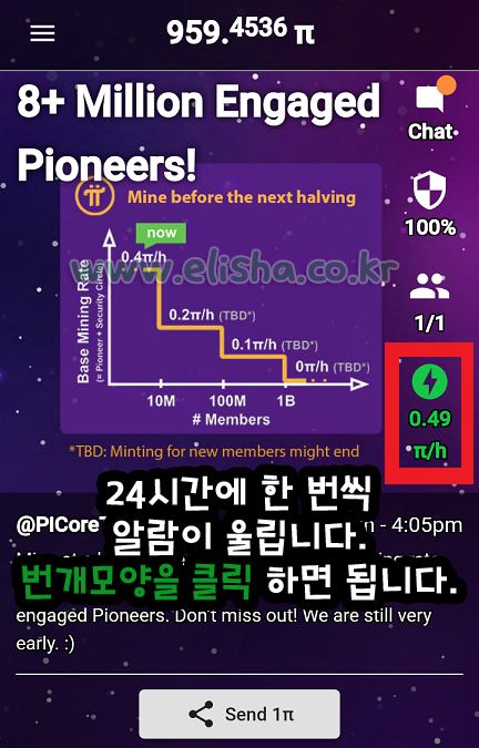 이제부터 앞으로 할 일은 번개 ( 채굴 ) 버튼을 24시간 마다 1번씩 터치해주시면 자동으로 채굴이 됩니다.