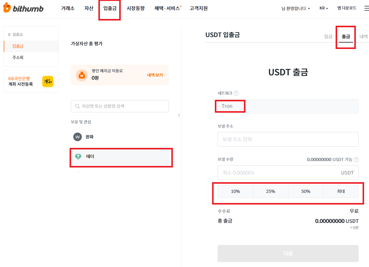 여기서 복사한 주소를 빗썸 USDT 출금 보낼 주소에 붙여넣기 해주시고 출금 진행하시면 됩니다!