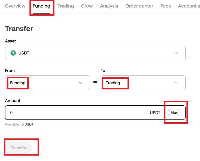 들어가셔서 Asset ( USDT 테더 ) - From ( Funding ) - To ( Trading ) 확인하시고