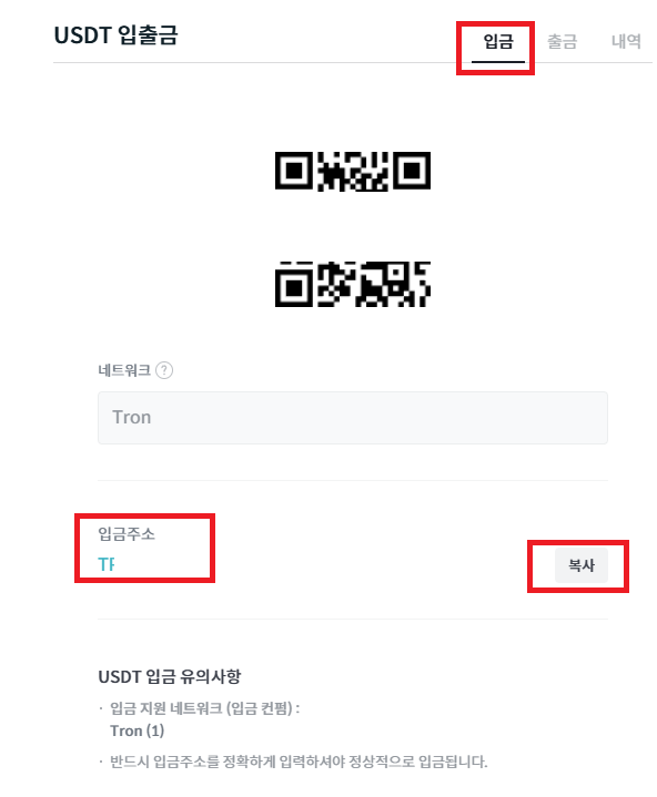 1. 빗썸 입. 출금에서 테더 입금을 누르시고 내 입금 주소 복사
