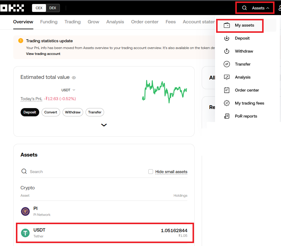 다음으로 해야될 순서는 OKX에 입금된 테더를 펀딩 모드에서 트레이딩 모드로 변경 후 파이를 구매하시면 됩니다.